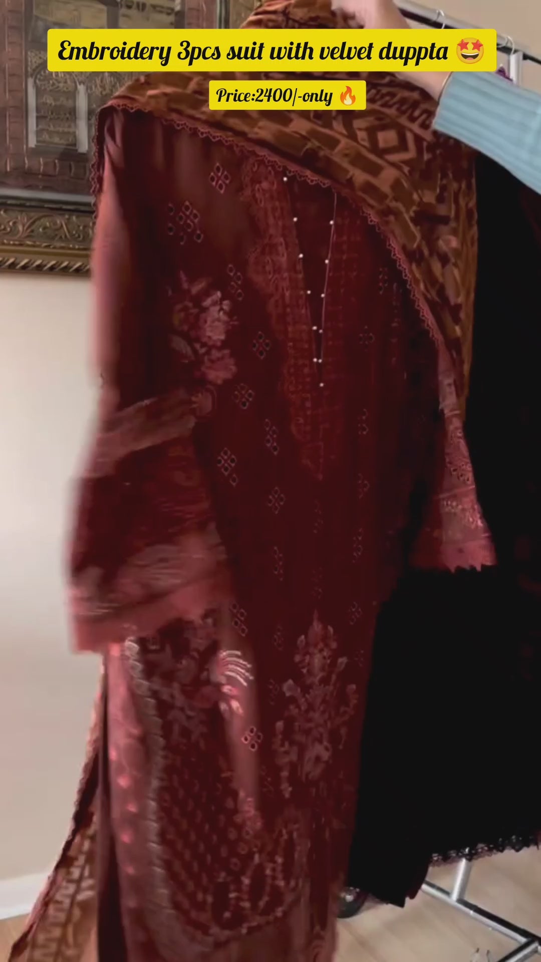 Product Description: beautiful embroidery 3pcs suit with velvet duppta premium collection all sizes and colors are available 💖 💯